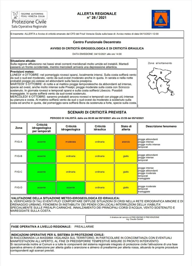 È stata diramata un' allerta meteo dalla protezione civile regionale del Friuli Venezia Giulia (immagine a fine articolo).