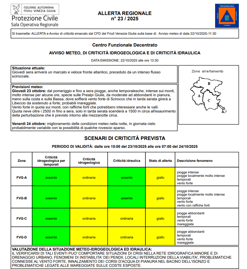 Nel corso del 23 ottobre sono attese piogge via via più intense fino a temporali sui rilievi, in particolare sulle Prealpi Giulie, con cumulate molto elevate in alcune finestre orarie; in pianura i fenomeni saranno da moderati ad abbondanti, più scarsi sulla Bassa e sul litorale. Sulla costa soffierà Scirocco forte con probabili mareggiate, in rotazione a Libeccio tra la tarda serata e la notte.