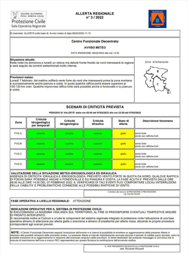 Allerta regionale 3/2022: dalle ore 05:00 alle ore 24:00 del 07 febbraio allerta gialla su tutte le zone Fvg per vento forte con possibili raffiche forti. La fase acuta e' prevista dalle ore 08:00 alle ore 14:00 del 7 febbraio. Secondo ultime analisi meteo, domani mattina, pomeriggio, su diverse zone le raffiche di vento da nord, potrebbero raggiungere e superare i 70kmh. Sulle zone montane alpine, localmente le raffiche potrebbero superare abbondantemente i 110kmh. Attenzione a ciò che normalmente tenete all'esterno, cortili e terrazze.