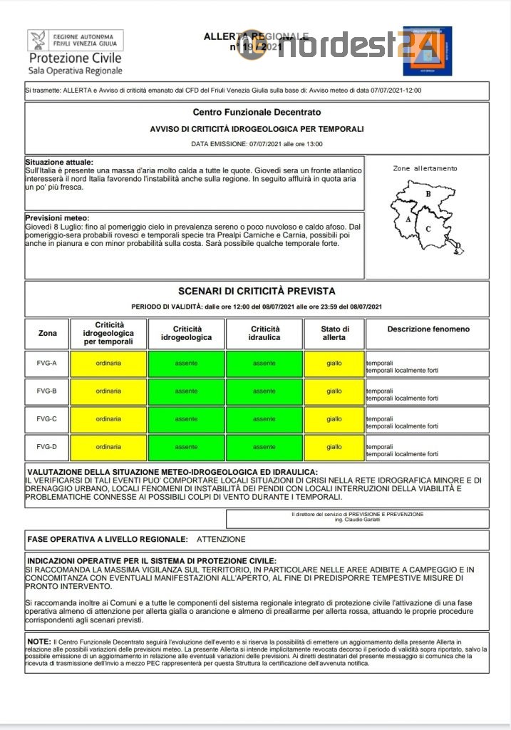Allerta regionale n. 19/21: dalle ore 12:00 alle ore 24:00 di giovedì 08/07 allerta gialla per rischio temporali forti.
