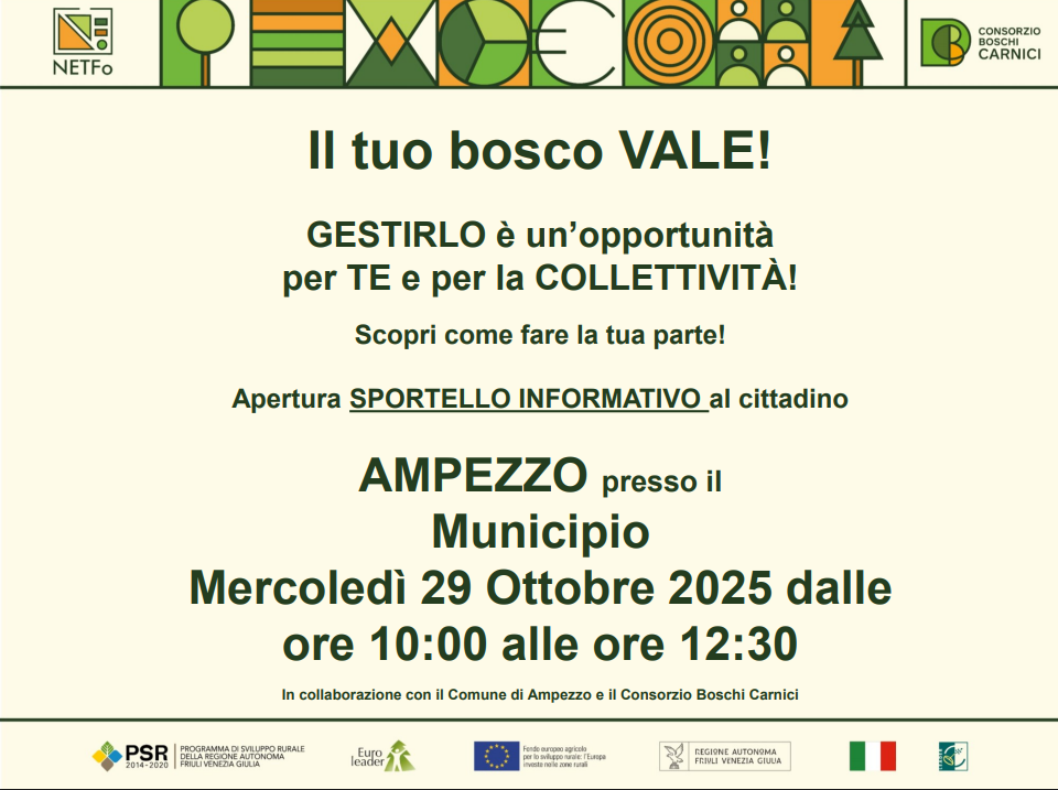 Dopo il positivo avvio a Ovaro, il Consorzio Boschi Carnici prosegue il suo percorso di informazione e sensibilizzazione sul territorio con il secondo appuntamento dedicato ai proprietari di boschi privati. Lo sportello informativo si aprirà ad Ampezzo (Ud) nella giornata di mercoledì 29 ottobre, presso i locali del Municipio, con orario di apertura dalle 10:00 alle 12:30.