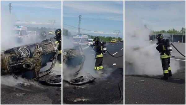 Paura sulla A4, violento scontro tra due auto: una prende fuoco dopo essersi ribaltata