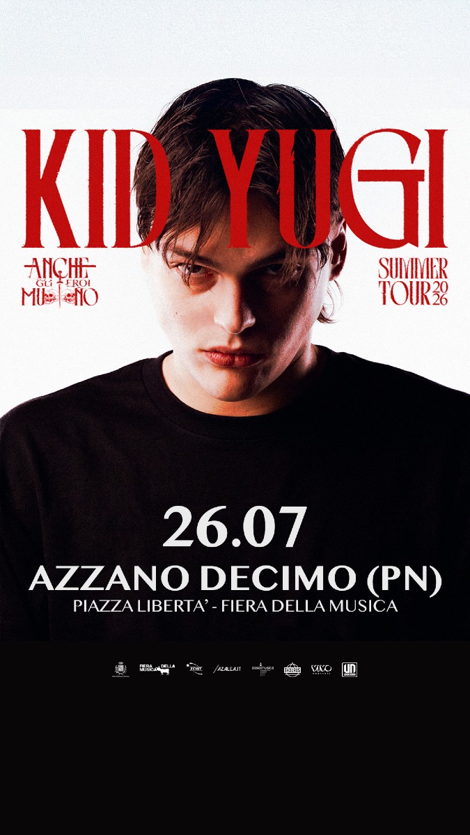 AZZANO DECIMO (PN) - Annunciato il terzo grande ospite della Fiera della Musica di Azzano Decimo (PN). Dopo le ufficializzazioni delle scorse settimane dei concerti di Elio e le Storie Tese (27 luglio) e delle stelle del celtic punk Dropkick Murphys (28 luglio), ad aprire la rassegna sarà la nuova star della music urban italiana, Kid Yugi, che porterà in Piazza Libertà il prossimo 26 luglio (inizio alle 21.00) l’unica data in Friuli Venezia Giulia del suo “Anche gli eroi muoiono – Summer Tour 2026”, con cui sarà protagonista nei principali festival della penisola. I biglietti per il concerto, organizzato da Zenit Srl, in collaborazione con il Comune di Azzano Decimo, la Regione Friuli Venezia Giulia e PromoTurismoFVG, saranno in vendita dalle 14.00 di mercoledì 25 marzo sul circuito Ticketone. Info e punti autorizzati su www.azalea.it.