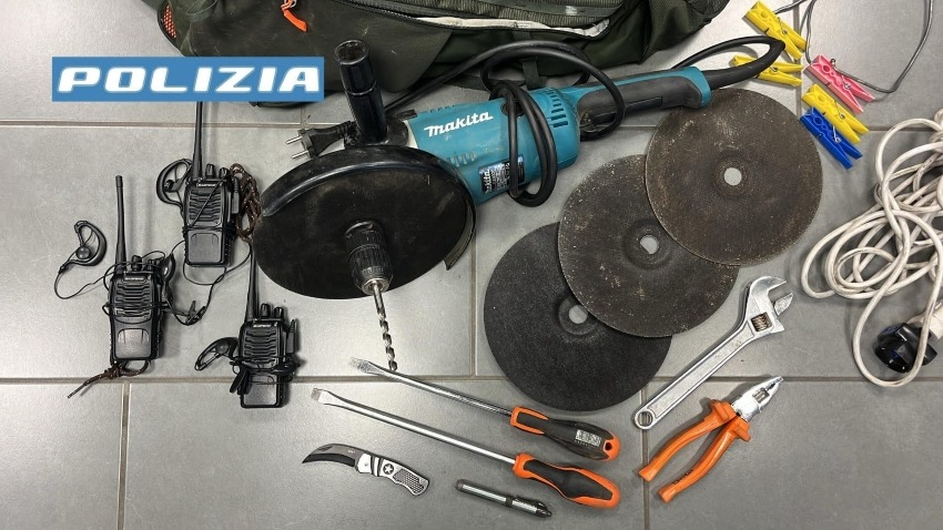 Durante la perquisizione sono stati trovati un flessibile, dischi, punte, cacciaviti, pinze, e ricetrasmittenti, utilizzate per coordinarsi durante i furti ed evitare localizzazioni.