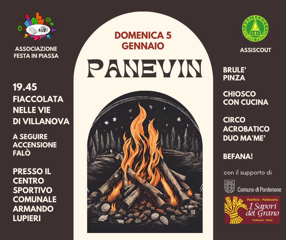 Il 5 gennaio si terrà il tradizionale Panevin di Villanova presso il Centro sportivo comunale A. Lupieri, organizzato dalla Festa in Piassa. La serata inizierà alle 19.00 con l'apertura del chiosco, dove sarà possibile gustare specialità gastronomiche e bevande. Alle 19.45 partirà la tradizionale fiaccolata lungo le vie del quartiere, seguita dall'attesissima accensione del falò. L’evento sarà arricchito dallo spettacolo di circo acrobatico del Duo Mamè e dalla consegna dei regali ai bambini da parte della Befana. Il ricavato della serata sarà devoluto al comprensorio scolastico Pordenone Sud.