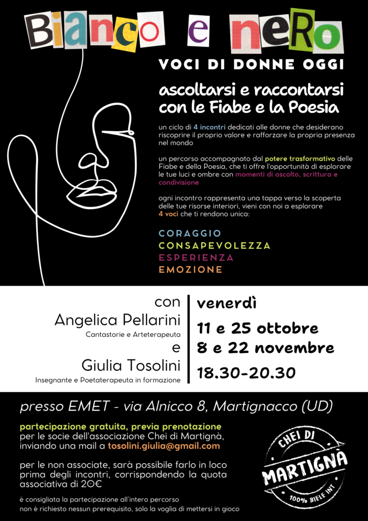 MARTIGNACCO. Un percorso espressivo per riscoprirsi e raccontarsi attraverso fiabe e poesia. Nell’agenda autunnale dell’associazione Chei di Martignà fa capolino “Bianco e Nero: voci di donne oggi”, u...