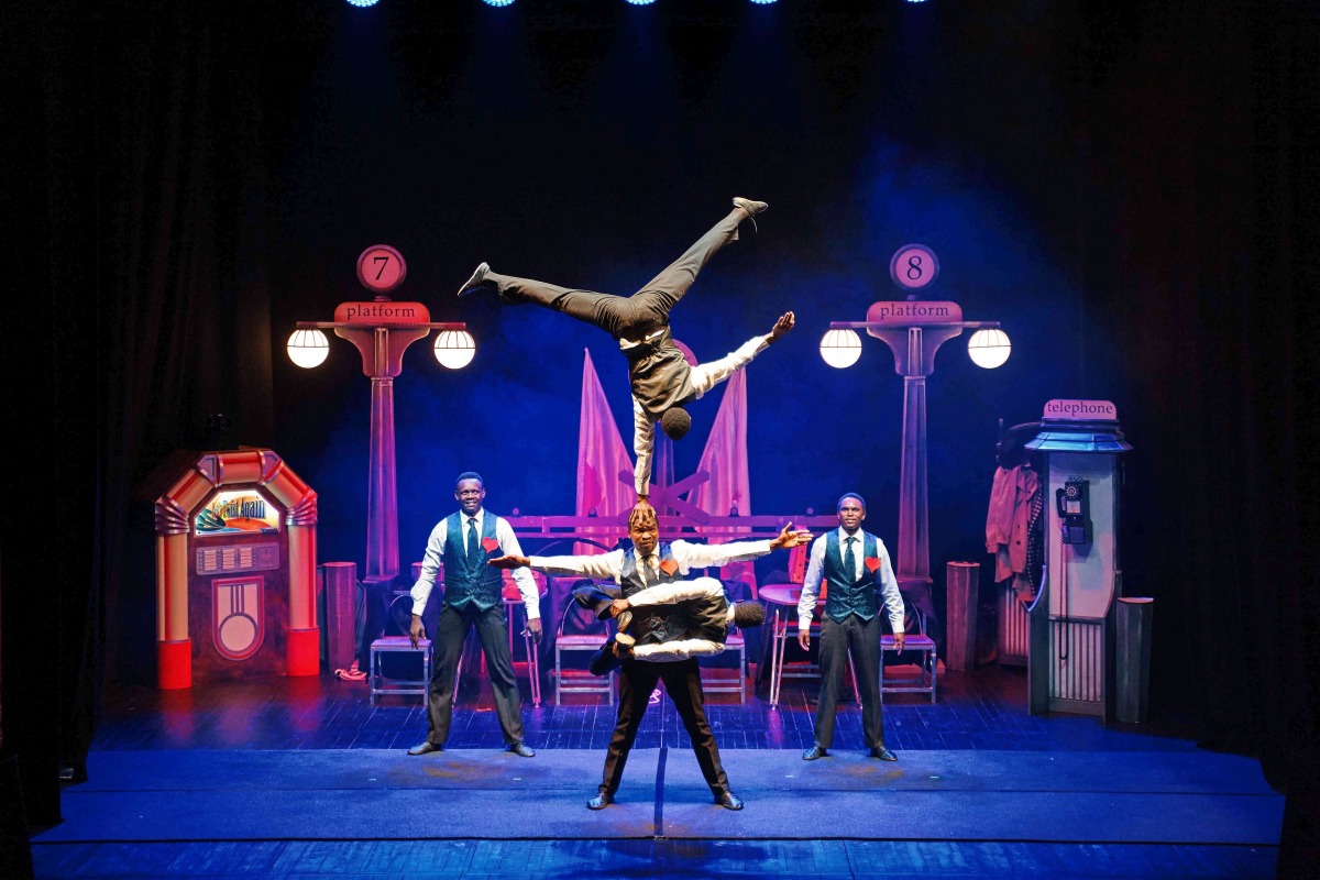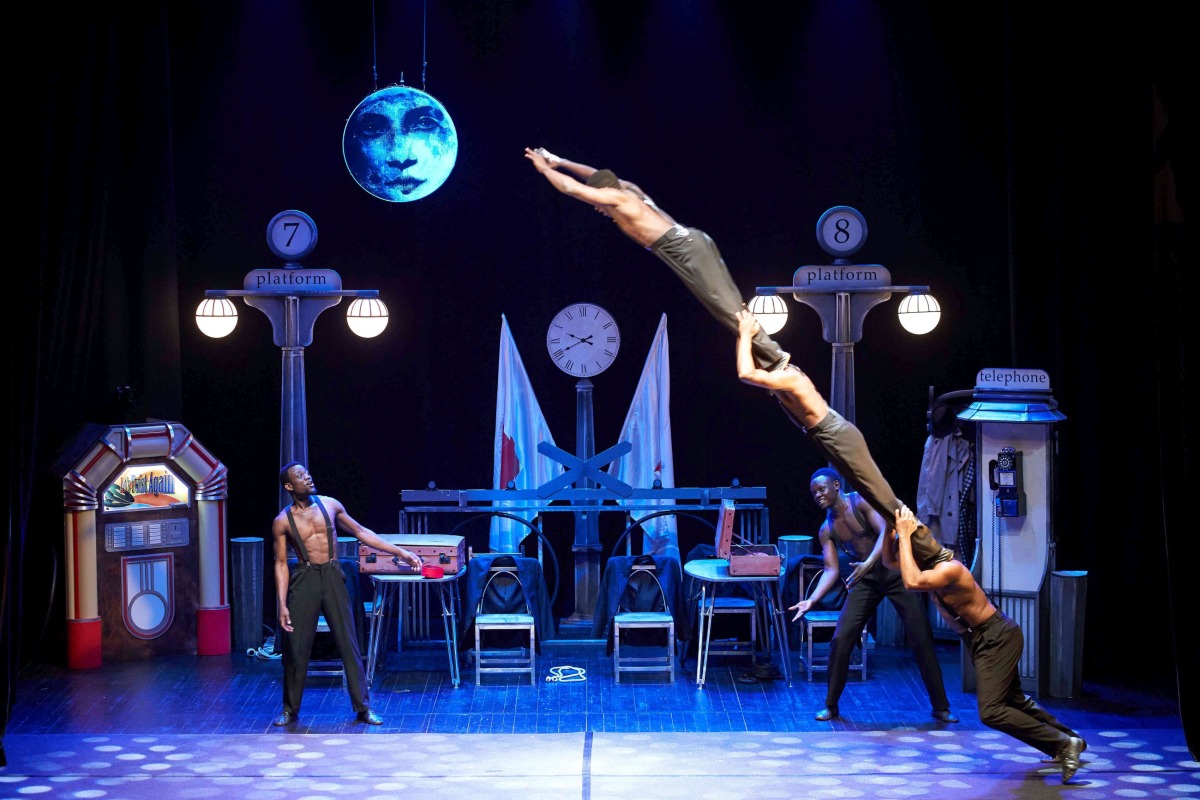 L’azione si svolge nella sala d’attesa di una stazione ferroviaria dove cinque uomini, vestiti con eleganti trench ispirati al cinema classico, aspettano qualcuno o qualcosa. Per ingannare il tempo si affidano alla musica di un jukebox d’epoca. Da qui nasce una sequenza serrata di numeri acrobatici che trasforma l’attesa in spettacolo. Tra salti, piramidi umane e virtuosismi, il gruppo utilizza tutto ciò che lo circonda – sedie, tavoli, dischi, bandiere e perfino i passaggi a livello – per costruire un racconto dinamico e sorprendente.