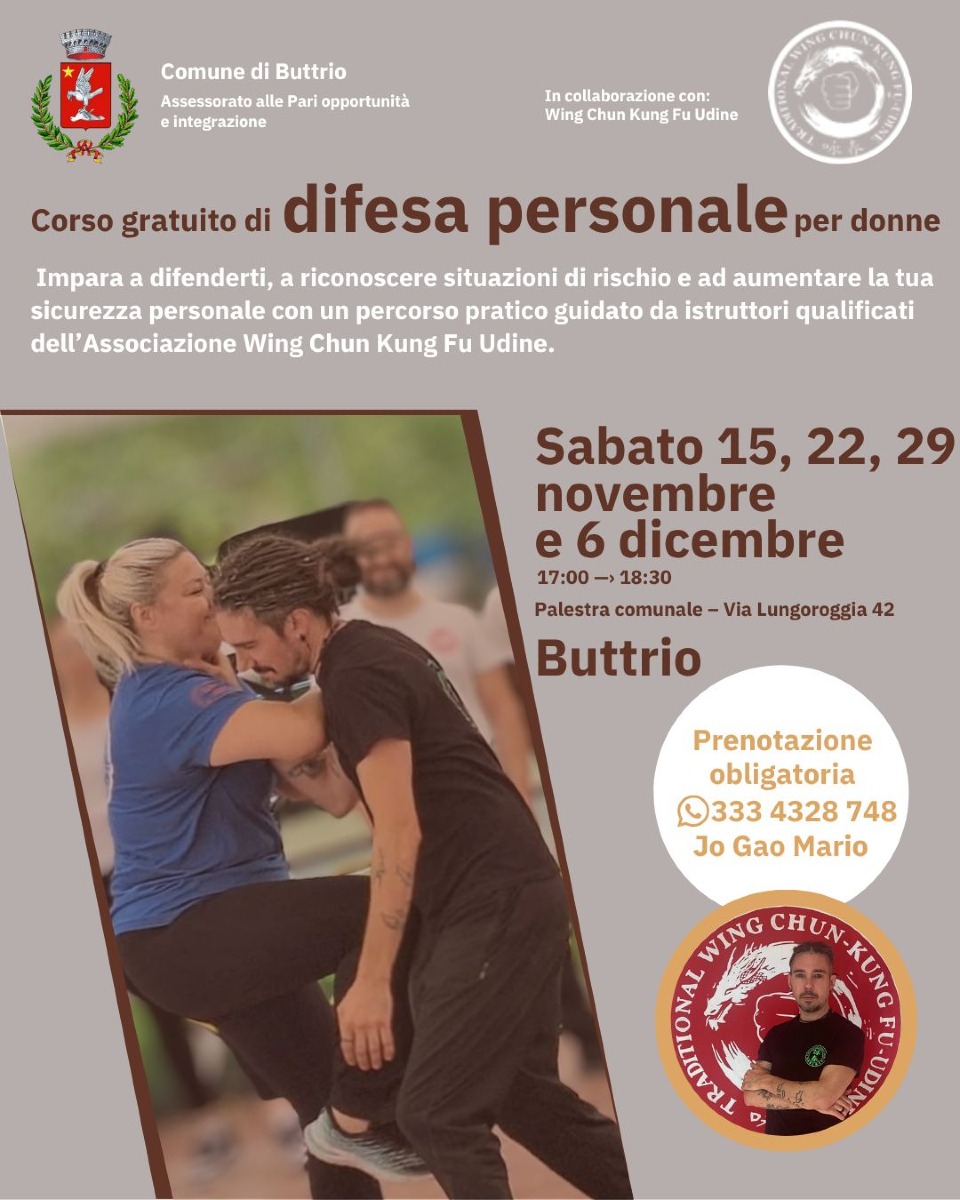 BUTTRIO (UD) – Dopo il grande successo della prima edizione, il Comune di Buttrio rinnova il suo impegno nella promozione della sicurezza femminile e della prevenzione della violenza di genere con un nuovo ciclo del corso gratuito di autodifesa per donne, organizzato dall’assessorato alle Pari Opportunità e Integrazione, con il contributo della Regione Friuli Venezia Giulia – Direzione centrale lavoro, formazione, istruzione e famiglia, in collaborazione con l’associazione Wing Chun Kung Fu Udine.