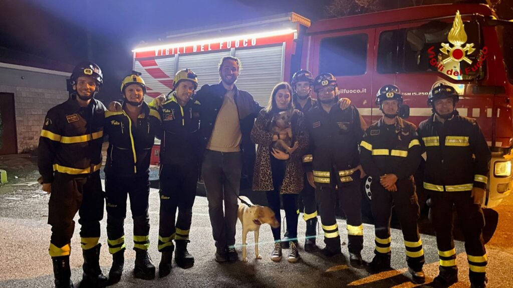 Dopo le operazioni durate circa 2 ore, I Vigili sono riusciti a riaffidare il giovane cane, lievemente ferito, ai propri padroni.