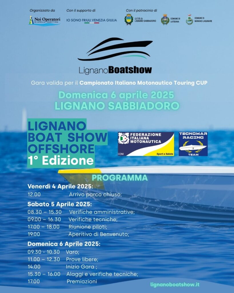 4 aprile 2025 - Sabato 5 e domenica 6 aprile prenderà il via, per la prima volta da Lignano Sabbiadoro, il Campionato Italiano Diporto categoria Touring Cup. La competizione è organizzata dalla Federazione Italiana Motonautica (FIM) e dall’ASD Team Tecnomar Racing nell’ambito della 7^ edizione della Lignano Boat Show, la più grande fiera della piccola nautica da diporto e dei servizi nautici, realizzata dall’Associazione Noi Operatori di Aprilia Marittima, in collaborazione con Promoturismo FVG e con il patrocinio dei comuni di Lignano Sabbiadoro, Latisana e Marano Lagunare.