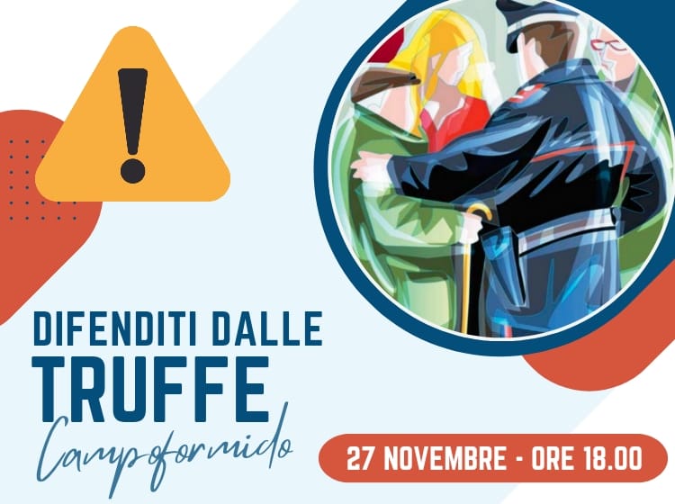 Il Comune di Campoformido ha organizzato un evento gratuito dedicato alla prevenzione delle truffe, che si terrà il 27 novembre 2024 alle ore 18:00 presso la Sala Polifunzionale "A. Geatti". L'incontro ha l’obiettivo di sensibilizzare la comunità riguardo le modalità con cui i truffatori operano e fornire a tutti i partecipanti gli strumenti utili per riconoscere e difendersi dalle truffe, un fenomeno purtroppo sempre più diffuso.