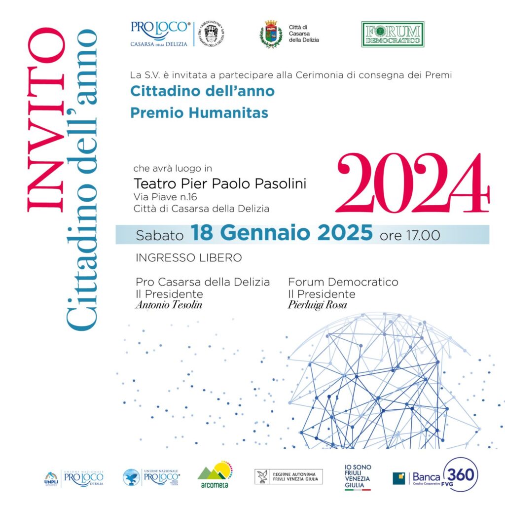 - Diploma Humanitas: sarà consegnato all’associazione di volontariato Par San Zuan, attiva dal 1987. Con una cinquantina di soci e oltre 150 volontari, organizza eventi tradizionali come la Fiesta di San Zuan, il Carnevale e il Mercatino natalizio, sostenendo progetti di solidarietà. Il premio sarà ritirato dal presidente Marco Francescutti e da una delegazione dei volontari.
