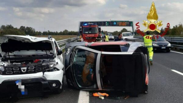 Tamponamento tra due auto in A28, una si rovescia più volte