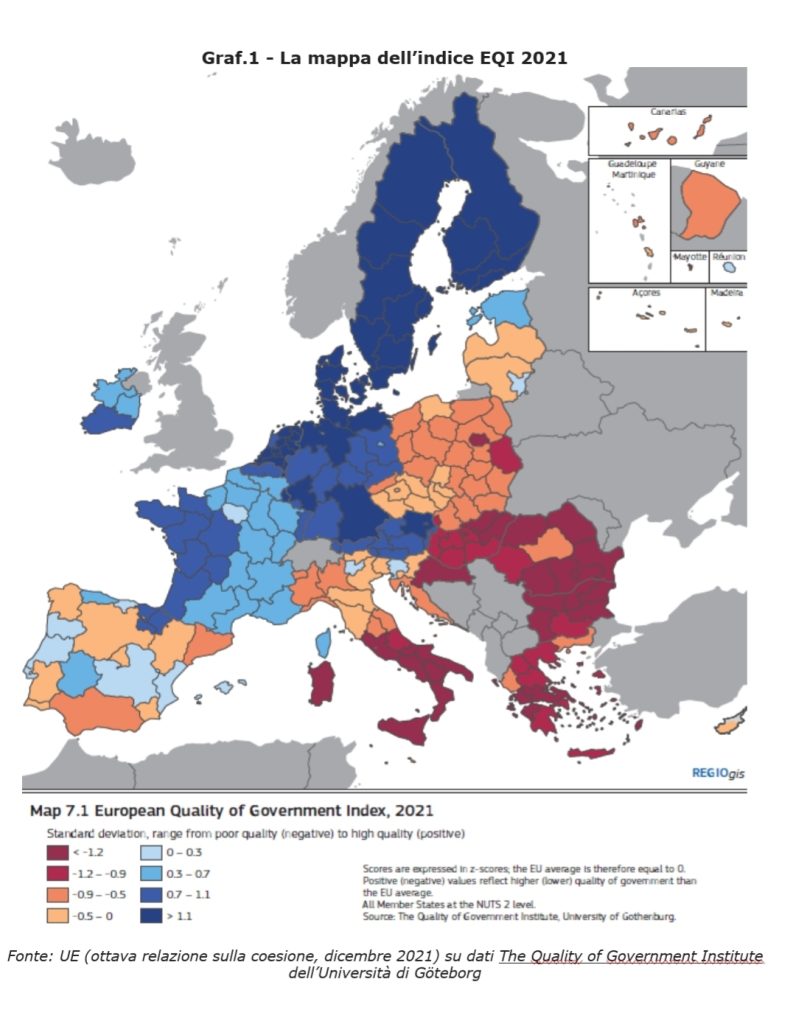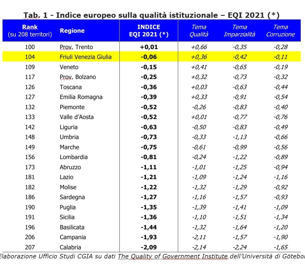 Se, comunque, ci confrontiamo con il resto d’Europa, il gap rimane molto importante. Nel 2021 l’Università di Göteborg ha redatto un’indagine sulla percezione della qualità, imparzialità e corruzione della PA in 208 regioni europee. Nel risultato finale il FVG si colloca al 104° posto; in Italia solo la Provincia Autonoma di Trento (al 100°) fa meglio della regione più a est del Paese. Puglia (190°), Sicilia (191°), Basilicata (196°), Campania (206°) e Calabria (207°) si “piazzano” negli ultimi 20 posti delle graduatoria generale. Fanalino di coda a livello europeo è la regione rumena di Bucaresti-Ilfov; quella più virtuosa, invece, è la finlandese Ǻland. L’indice finale sulla qualità istituzionale redatto dall’Università di Göteborg è frutto di un mix di quesiti posti ai cittadini che riguardano la qualità dei servizi pubblici, l’imparzialità con la quale questi vengono assegnati e la corruzione. Nello specifico i quesiti convergono su tre servizi pubblici che hanno valenza più “territoriale”: istruzione, sanità e pubblica sicurezza; l’indice finale, oltre ai dati delle indagini regionali, tiene conto anche di altri servizi più generali (ad esempio la giustizia), includendo alcuni indicatori del WGI data della Banca mondiale (dati nazionali) (vedi Tab.1 e Graf. 1).