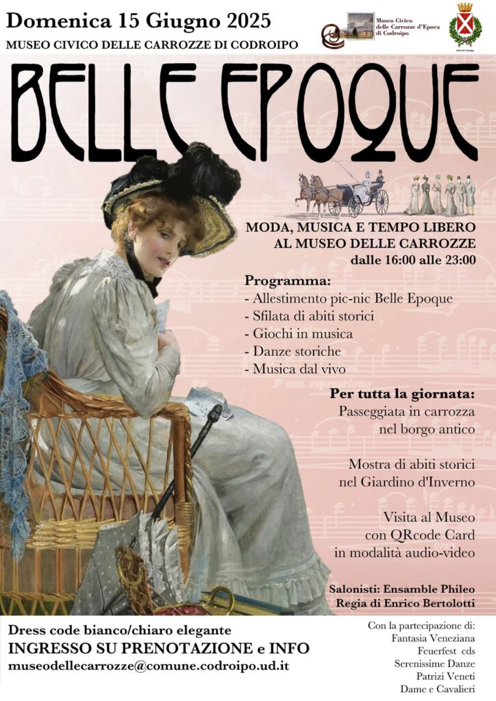 CODROIPO (UDINE) – Domenica 15 giugno 2025, il Museo Civico delle Carrozze d’Epoca ospiterà un evento straordinario, un vero e proprio salto indietro nel tempo, tra eleganza, musica e costumi d’epoca. Dalle 16.00 alle 23.00, il borgo di San Martino si trasformerà in un palcoscenico della Belle Époque, epoca affascinante tra la fine dell’Ottocento e l’inizio del Novecento.