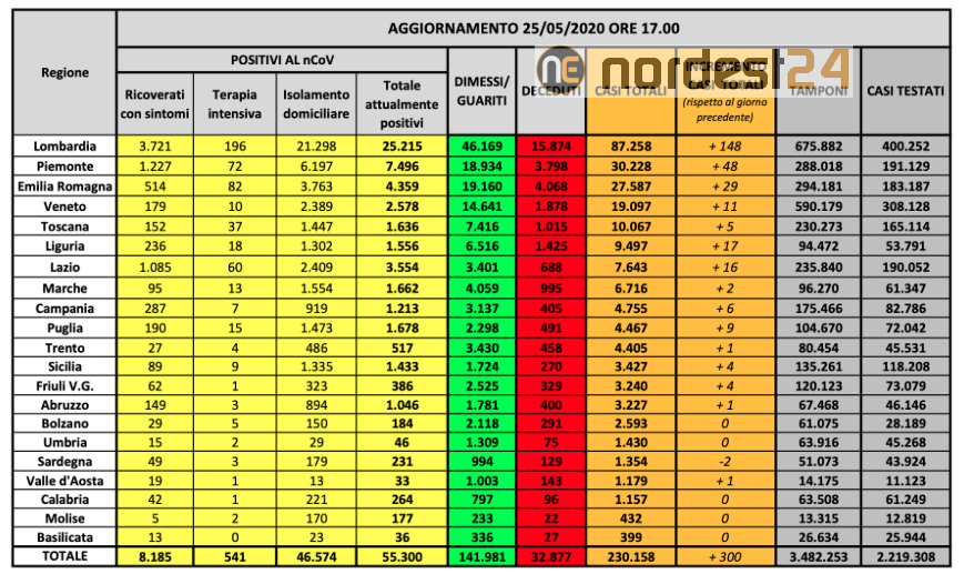 In particolare, nell’ambito del monitoraggio sanitario relativo alla diffusione del Coronavirus sul nostro territorio, a oggi, 25 maggio, il totale delle persone che hanno contratto il virus è di 230.158, con un incremento rispetto a ieri di 300 nuovi casi.