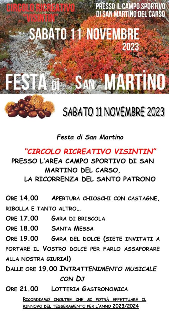 il circolo ricreativo “visintin”, organizza la Festa di San Martino in cui dalle ore 14, potrete trovare lotteria e intrattenimento musicale, castagne e ribolla, gara di briscola e la mitica gara di dolci.