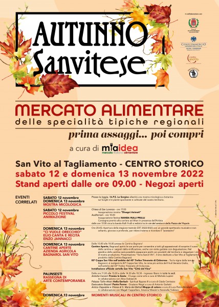 San Vito al Tagliamento si veste di autunno con l'evento "Autunno Sanvitese", che per due giorni offre mercatini, showcooking e ospiti speciali, tra cui Luca Colombo e Lume Lami. Lavariano festeggia con l'antica tradizione di San Martino, proponendo l'Oca e il Vin Novello in piazza San Paolino.