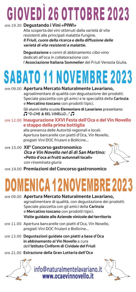 La figura dell'oca è intrinsecamente legata alla festività di San Martino a causa di un'antica leggenda. Si dice che il santo, riluttante a lasciare la vita monastica per assumere l'incarico di vescovo di Tours, si fosse nascosto per evitare la nomina. Tuttavia, fu il chiasso delle oche a tradirne il nascondiglio, sventando così il suo tentativo di sottrarsi al destino. Per questo motivo, l'11 novembre e il mese di novembre sono tradizionalmente associati alla celebrazione con l'oca. A Lavariano, questa tradizione prende vita in Piazza San Paolino, dove si possono gustare prelibatezze a base di oca insieme al vin novello, evocando l'atmosfera festiva di un tempo e offrendo i sapori autentici del territorio. In occasione della festa, si terrà anche il Concorso Gastronomico "L'Oca nella Tradizione Friulana", una mostra-mercato con specialità dalla Carinzia e dalla Toscana, e il tutto si concluderà con la tanto attesa lotteria dell'Oca.