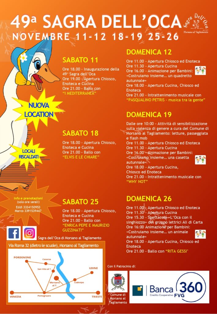 L'Associazione Sagra dell'Oca organizza la Sagra dell'Oca dal 1972 a Morsano al Tagliamento. Saranno tre weekend di novembre con piatti a base d'oca, che negli anni li hanno resi famosi e conosciuti, non solo nei dintorni. Dal tagliere di affettati d'oca agli gnocchi con ragù d'oca, passando per sfiziosi secondi piatti sempre a base d'oca. Naturalmente, offrono anche alternative per coloro a cui non piace l'oca. Ad accompagnare i piatti ci pensa la fornita enoteca con vini di qualità di provenienza friulana. E, per finire il pasto in dolcezza, una golosissima nutella.