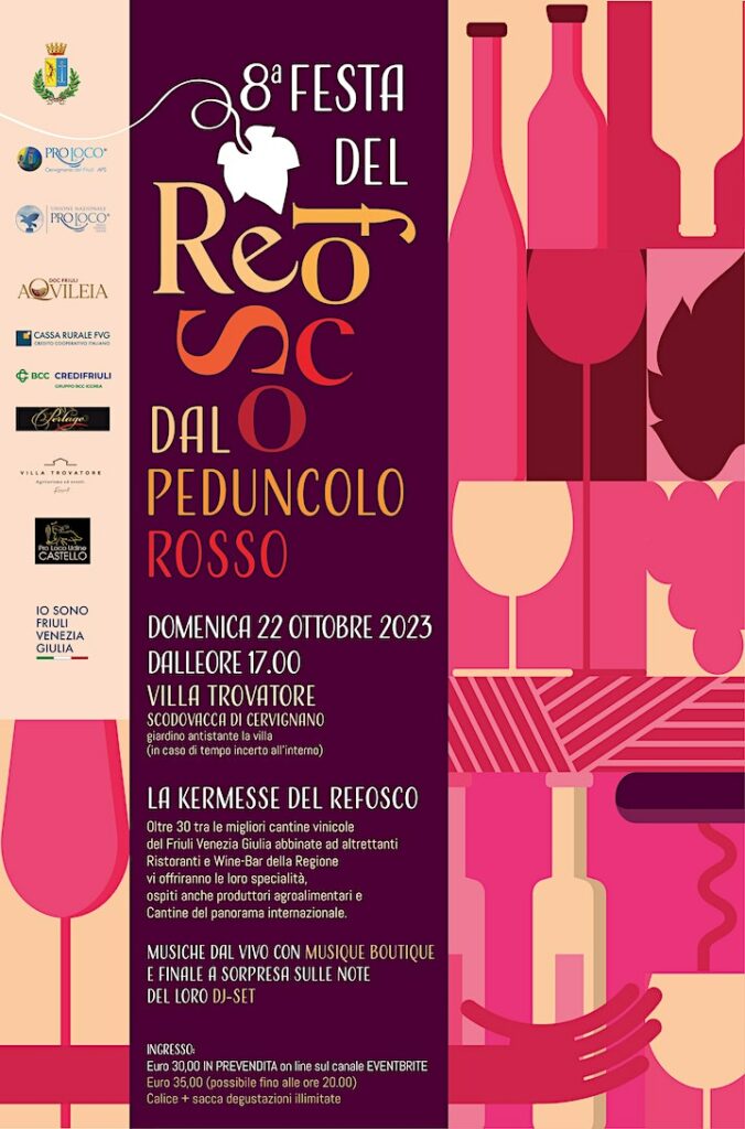 La Pro Loco Cervignano del Friuli Aps in collaborazione con il Comune di Cervignano del Friuli, organizzano la 8à edizione della Festa del Refosco dal Peduncolo Rosso. Il territorio della bassa friulana festeggerà l'eccellenza di un vino autoctono tra i piu' esclusivi, nella splendida cornice della Villa Trovatore di Scodovacca, paese delle origini del Refosco dal Peduncolo Rosso, il tutto domenica 22 ottobre 2023. Presenti alla manifestazione ci saranno le aziende vitivinicole del Consorzio Doc Aquileia e altre provenienti dal resto del Friuli Venezia Giulia. Alternando le degustazioni dei vini, ci sarà la possibilità di assaggiare le pietanze di altrettante aziende di ristorazione del territorio e fuori. Ci accompagnerà musica con Dj Set iniziale per poi immergerci nelle fantastiche note dei Musique Boutique fino alle ore 22. Molte collaborazioni faranno da partners all’evento: Io sono Friuli Venezia Giulia, Credi Friuli, Cassa Rurale FVg, Pro loco Castello di Udine, Perlage, Villa Trovatore di Rossato, Consorzio Montasio, Consorzio San Daniele del Friuli, e tanti altri