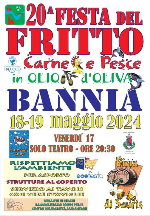 Bannia (PN) – La 20ª edizione della Festa del Fritto inizierà con uno spettacolo teatrale, seguito dall'apertura dei chioschi il sabato e la domenica. Un'occasione per gustare fritti di ogni tipo in un'atmosfera di festa. La varietà di piatti offerti e la qualità delle preparazioni rendono questa sagra un appuntamento imperdibile per gli amanti del cibo.