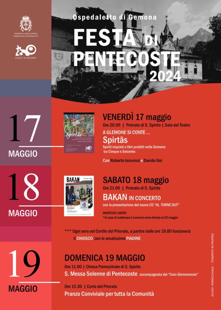Ospedaletto di Gemona (UD) – Dal 17 al 19 maggio, la borgata di Ospedaletto ospiterà la tradizionale Festa di Pentecoste, con appuntamenti culturali, musicali e cerimonie religiose. Un evento che unisce spiritualità e tradizione. La festa è un'occasione per riscoprire le radici culturali e spirituali della comunità, partecipando a momenti di riflessione e divertimento.