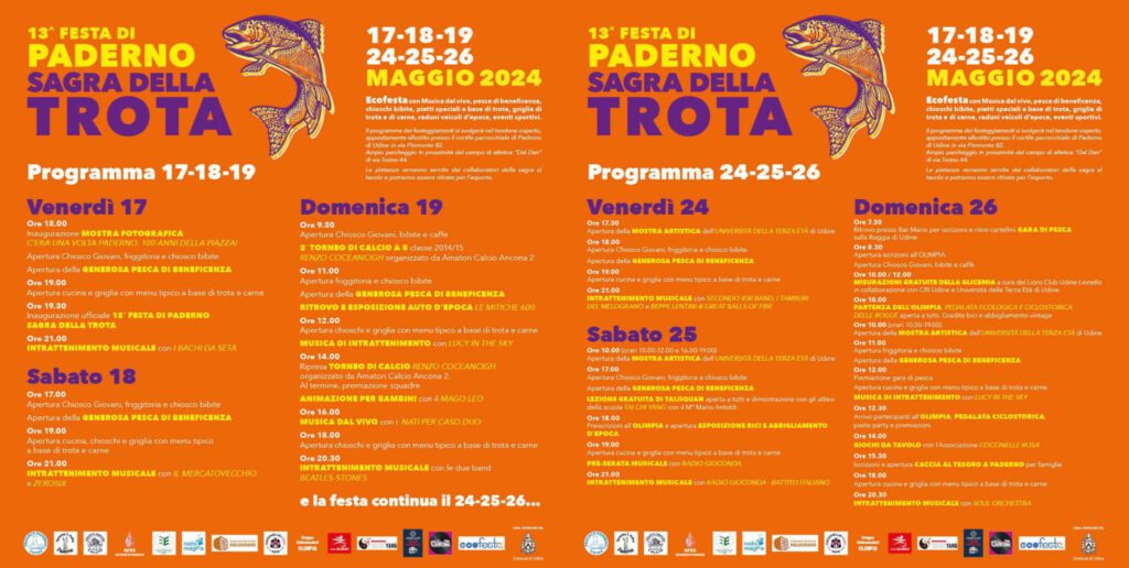 Paderno di Udine (UD) – La 13ª Sagra della Trota si terrà dal 17 al 19 e dal 24 al 26 maggio, con un grande tendone coperto dove si potranno gustare specialità a base di trota e altre delizie culinarie. La festa è conosciuta per l'attenzione alla qualità dei prodotti e per l'accoglienza calorosa dei suoi organizzatori.