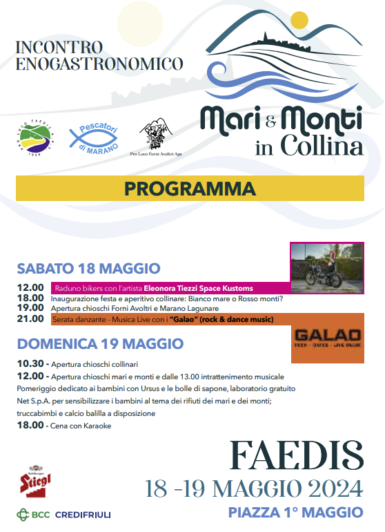 Faedis (UD) – Il 18 e 19 maggio, Faedis ospiterà "Mari e Monti in Collina", un evento che celebra l'incontro tra mare e montagna, offrendo delizie gastronomiche in una cornice suggestiva di colline e vigneti. La sagra è un'opportunità per scoprire le eccellenze gastronomiche del territorio e trascorrere una giornata immersi nella natura.