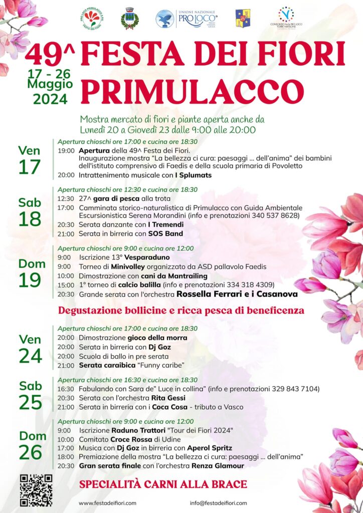 Primulacco (UD) – Giunta alla sua 49ª edizione, la Festa dei Fiori di Primulacco è una sagra che, oltre al mercato di fiori e piante, offre eventi musicali e attività per tutta la famiglia. La varietà di fiori e piante in vendita e le numerose attività proposte rendono questa festa un appuntamento imperdibile per gli appassionati di giardinaggio e per chi cerca un'occasione di svago.