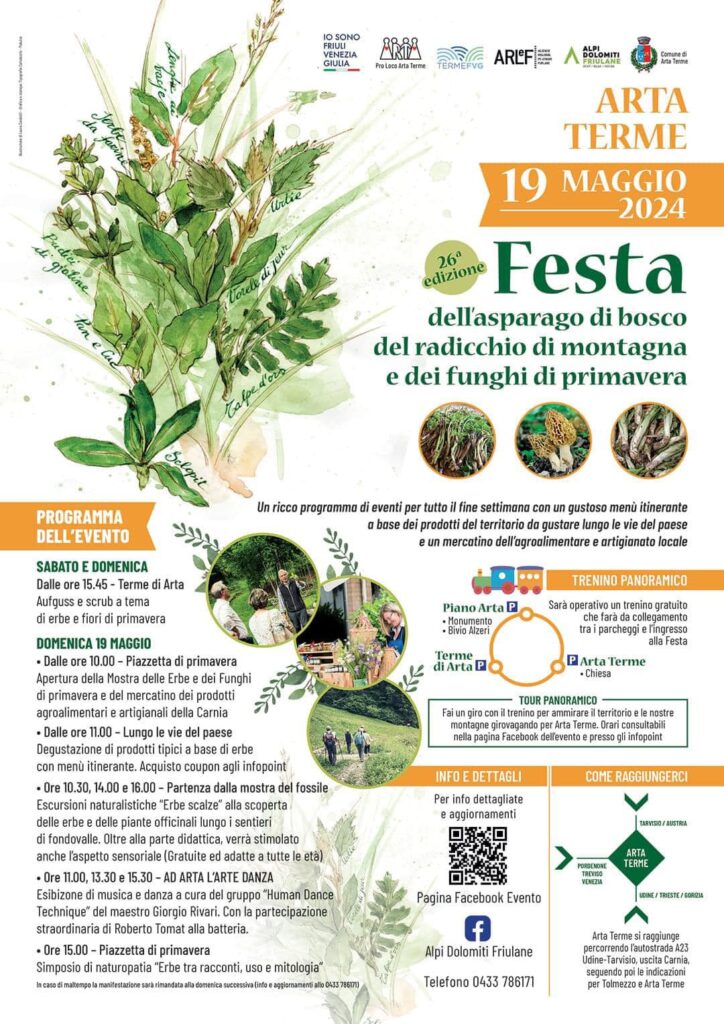 Arta Terme (UD) – Ad Arta Terme, la primavera si celebra con una festa dedicata alle erbe e ai funghi di stagione, tra cui asparagi di bosco, radicchio di montagna e funghi. Le primizie primaverili di questa festa gastronomica sono un'occasione per assaporare i sapori autentici del territorio.