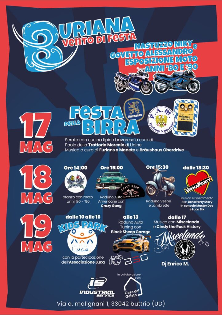 Buttrio (UD) – La nuovissima festa "La Buriana" porterà una ventata di aria fresca con tre giorni di eventi, musica e specialità culinarie. Un'opportunità per scoprire la vivace comunità locale. La Buriana rappresenta una novità nel panorama delle sagre friulane, ma ha già riscosso grande successo per l'originalità del suo programma e la qualità delle sue proposte gastronomiche.