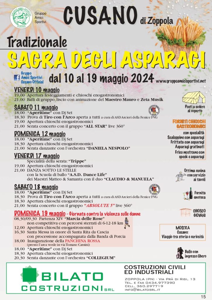 Cusano di Zoppola (PN) – La Sagra degli Asparagi 2024 è pronta a intrattenere i visitatori con musica dal vivo, balli e specialità a base di asparagi. Un'occasione perfetta per gustare prodotti freschi e divertirsi in compagnia. La festa si svolge in un'atmosfera allegra e spensierata, ideale per trascorrere una giornata all'insegna del buon cibo e della convivialità.