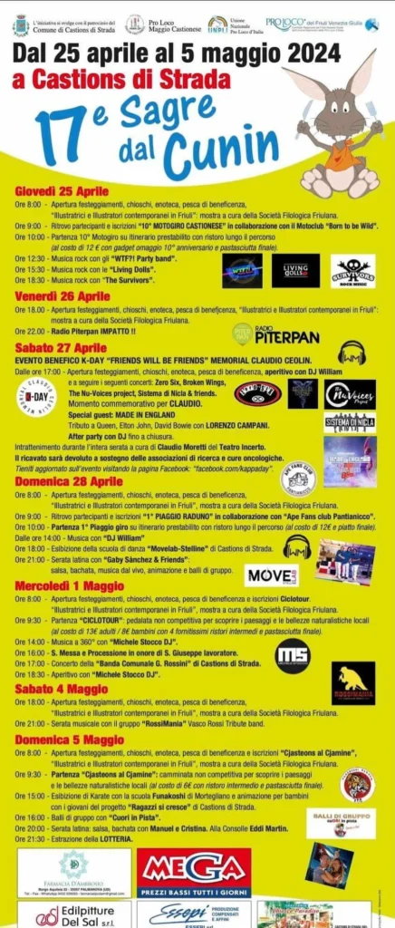La 17a edizione di questa sagra mette in primo piano il coniglio cucinato secondo ricette tradizionali. L'evento offre un mix di musica rock, balli di gruppo e latino americani, mostre fotografiche e attività all’aria aperta, creando un'atmosfera festosa e inclusiva.
