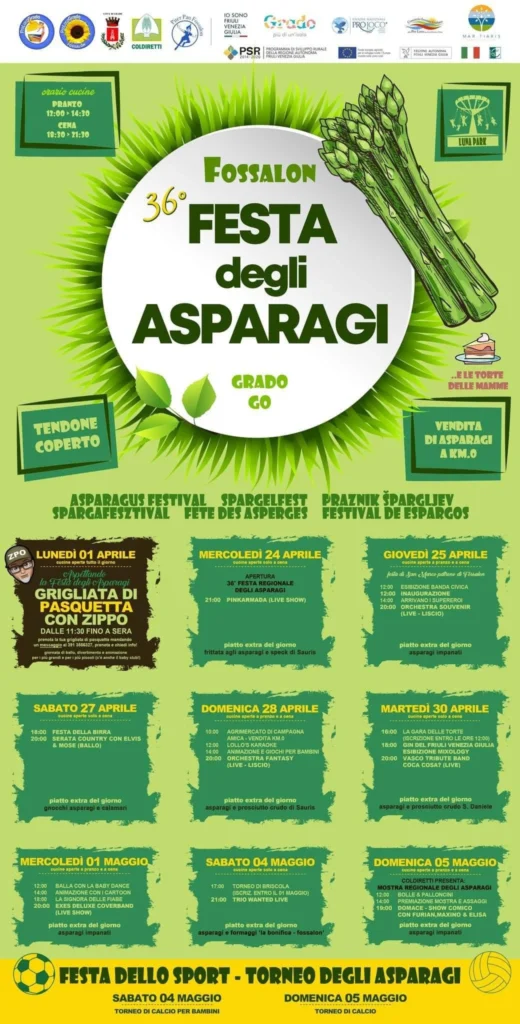 Ogni primavera, Fossalon di Grado diventa il palcoscenico della Festa degli Asparagi, dove il rinomato asparago bianco viene trasformato in deliziosi piatti come risotti e frittate. La festa include intrattenimento musicale con band come i Pink Armada e serate di ballo liscio, garantendo divertimento per un pubblico variegato.