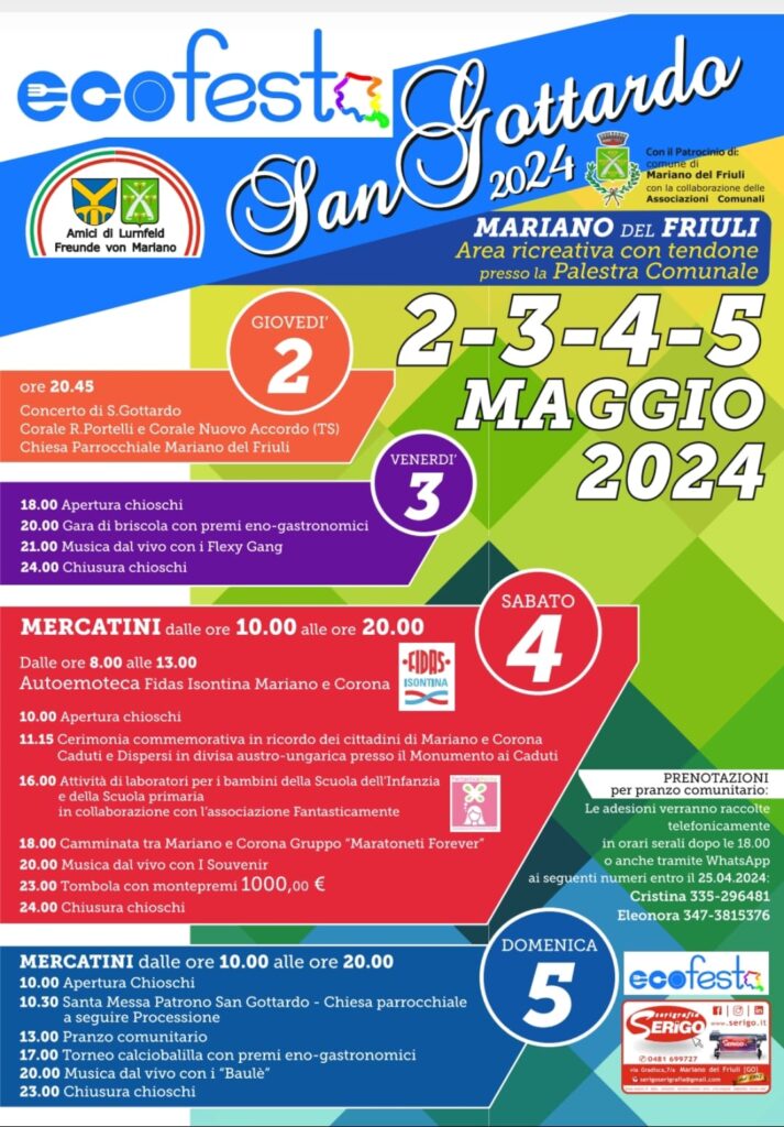 La festa patronale di San Gottardo a Mariano del Friuli offre quattro giorni di celebrazioni popolari, arricchite da una varietà di attività che includono chioschi gastronomici, tornei di briscola, serate di ballo liscio, attività sportive, concerti, giochi di tombola, mercatini e laboratori creativi per bambini. Un evento che promette divertimento per tutte le età e gusti.