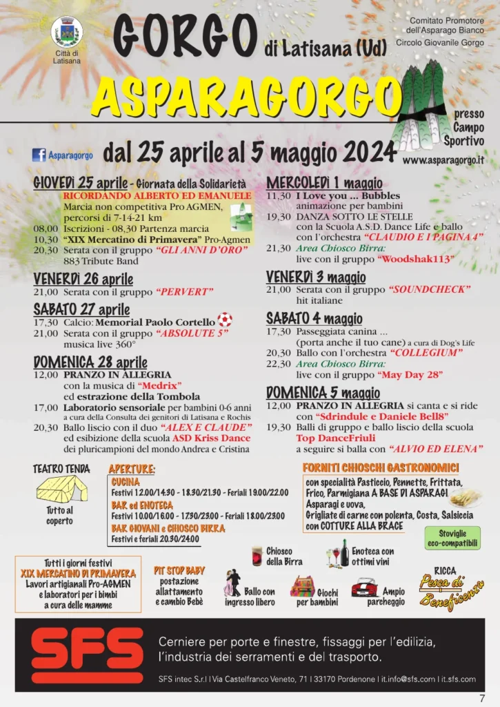 La 86a edizione della festa, che si tiene presso il campo sportivo di Tavagnacco, offre un'esplosione di sapori con piatti a base di asparagi. Gli ospiti possono deliziarsi con musiche dal vivo di band come gli Exes e assistere allo spettacolo tributo agli Abba. L'evento combina anche sport, degustazioni guidate e attività ricreative, creando un'esperienza unica per partecipanti di tutte le età.