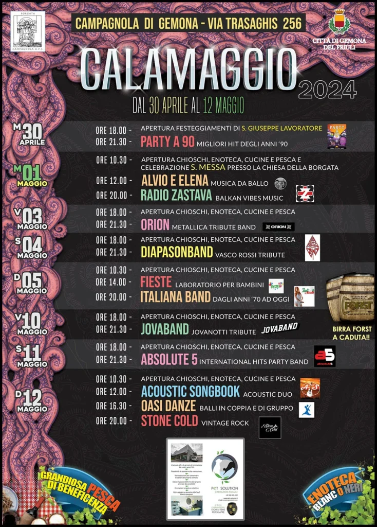 Dal 30 aprile al 12 maggio 2024, Campagnola a Gemona del Friuli celebra la tradizione con "Calamaggio", una sagra che unisce musica tradizionale e moderna, gastronomia locale e una ricca serie di attività per tutti i gusti. Gli eventi musicali vedono protagonisti Alvio & Elena con il ballo liscio e band tributo a Jovanotti e Vasco Rossi. I visitatori potranno gustare piatti a base di calamari e esplorare una vasta selezione di vini regionali.