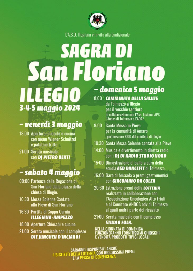 È la prima festa della stagione in Carnia e, seguendo la tradizione, per tre giorni animerà l'intera vallata con musica dal vivo, ospitando i celebri Die Jungen D’incjaroi e i Studio Folk. L'evento sarà arricchito da tornei di briscola, l'attesa lotteria, attività sportive, camminate, e naturalmente chioschi ben riforniti che offriranno wienerschitzel, patatine fritte, birra e vino a volontà.