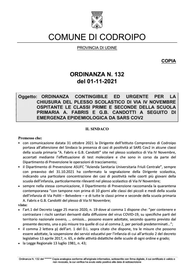 CODROIPO. "Per contenere la diffusione dei contagi e garantire la massima sicurezza ad Alunni e Famiglie, in accordo con il Dipartimento di Prevenzione e l’Istituto Comprensivo abbiamo disposto la chiusura del plesso scolastico di via IV Novembre ospitante le classi prime e seconde della scuola primaria A. Fabris e G. B. Candotti".