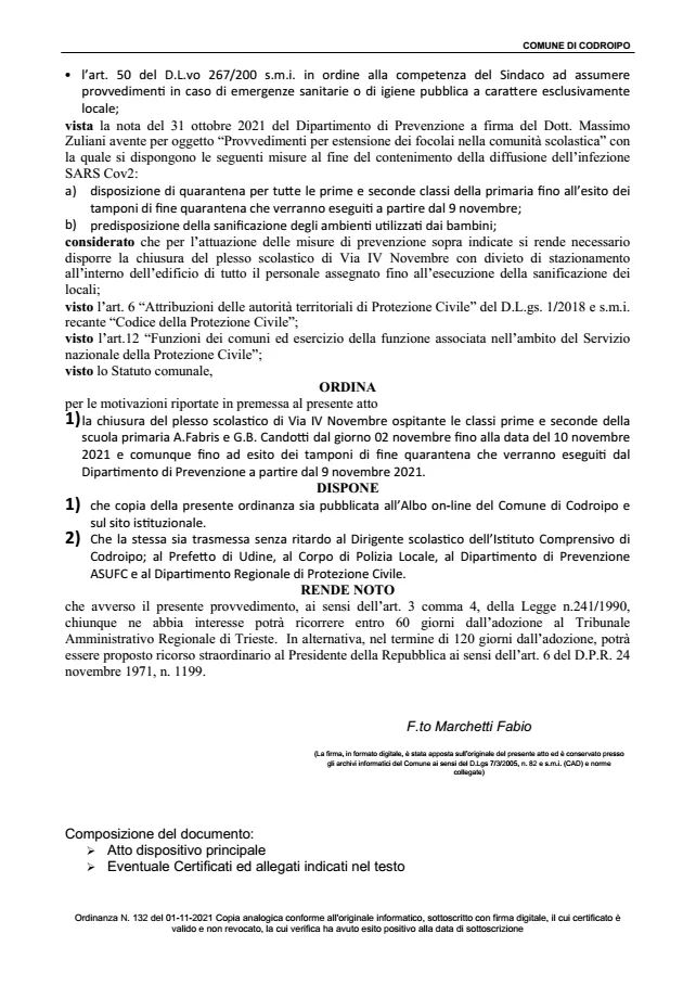 Lo rende noto il sindaco di Codroipo che su disposizione del dipartimento di prevenzione dell’Azienda sanitaria universitaria Friuli Centrale, ha firmato l'ordinanza contingibile e urgente di chiusura dopo la scoperta di un focolaio tra gli studenti. Una ventina i bambini risultati positivi.