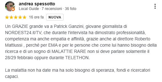 Un GRAZIE grande va a Patrick Ganzini, giovane giornalista di NORDEST24.it/TV, che durante l'intervista ha dimostrato professionalità, competenza ma anche empatia e affinità, grazie anche al direttore Roberto Mattiussi , perché per EMA e per le persone che come lui hanno bisogno della ricerca e di un sogno di MALATTIE RARE non si deve parlare solamente il 28/29 febbraio oppure durante TELETHON.