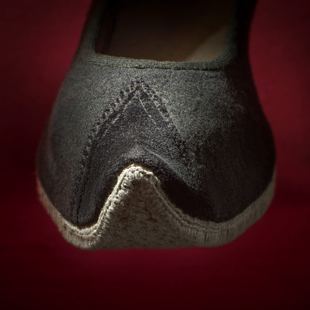 Anche i materiali giocano un ruolo cruciale nelle creazioni esposte. Lo scarpet in jeans di Ivan Delogu rappresenta un audace mix di praticità e stile, mentre il modello di Lilian Navarro, trasformato in uno stivaletto, unisce taffetà moiré grigia a inserti di pelle effetto serpente e dettagli che richiamano le sneakers, creando un ponte tra il mondo streetwear e quello della tradizione artigianale.