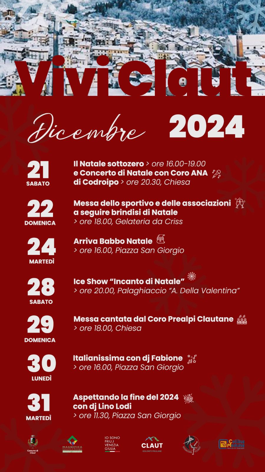 CLAUT, 19 DICEMBRE 2024 – Il Comune di Claut presenta un calendario natalizio e invernale pieno di eventi che animeranno il paese tra dicembre 2024 e gennaio 2025, creando un'atmosfera di festa, tradizione e divertimento per cittadini e turisti. Le festività saranno l'occasione perfetta per vivere il paese in modo unico, con eventi che spaziano dalla musica agli spettacoli, fino agli appuntamenti sportivi.