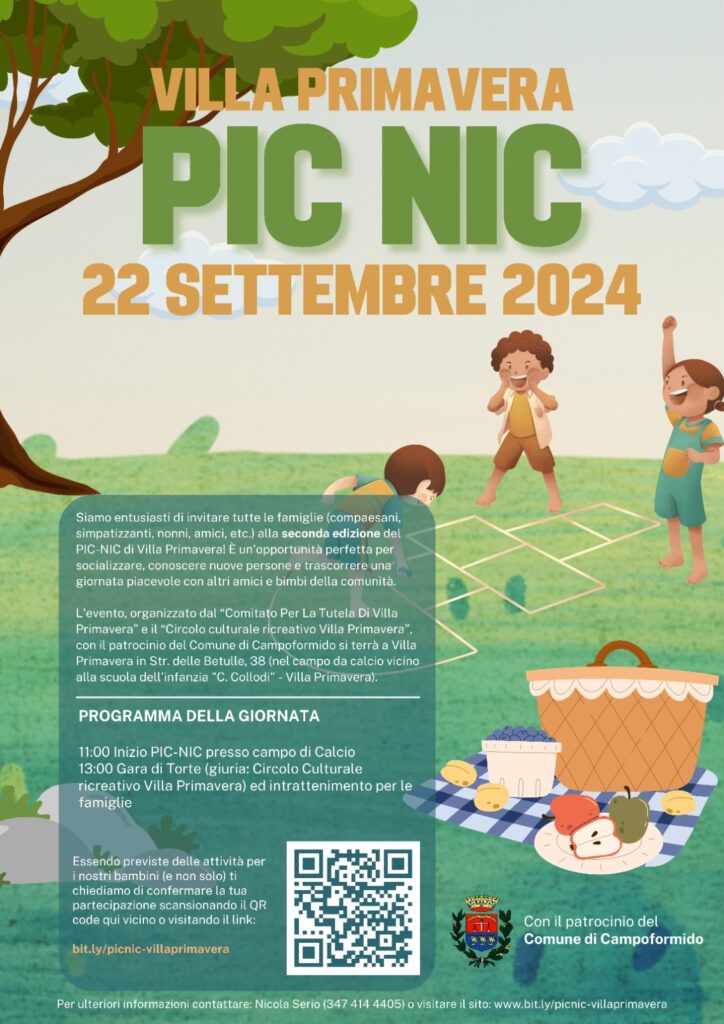 Il PICNIC di Villa Primavera è aperto a tutte le famiglie di Campoformido e dei comuni limitrofi. L’evento rappresenta un’opportunità imperdibile per passare una domenica all’aria aperta, godendo delle bellezze naturali e delle attività organizzate. Per garantire una gestione ottimale dell’evento, è consigliata la registrazione anticipata attraverso il seguente link: https://bit.ly/picnic-villaprimavera.