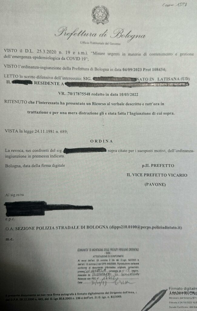 La risposta della Prefettura di Bologna e la revoca dell'Ingiunzione