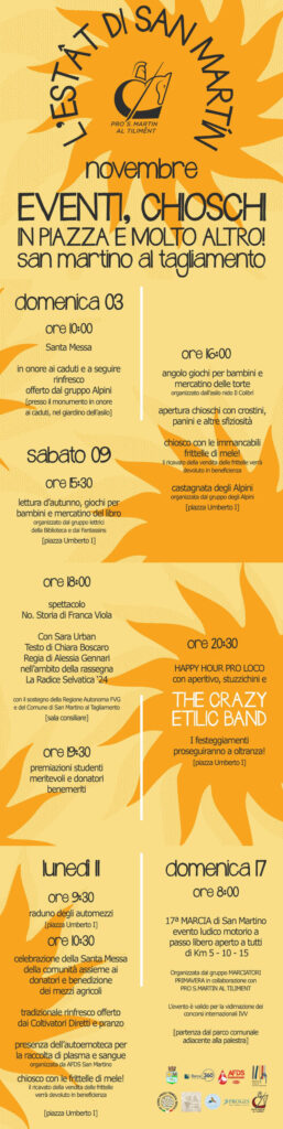 Novembre è un mese speciale per San Martino al Tagliamento, dove si svolgeranno una serie di eventi dedicati alla tradizione e alla comunità. La Festa di San Martin è un'importante manifestazione che si tiene nei giorni 3, 9, 11 e 17 novembre 2024, e offre una varietà di attività che coinvolgono residenti e visitatori in un’atmosfera di festa e convivialità.