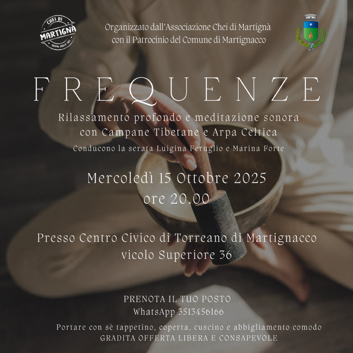 TORREANO DI MARTIGNACCO (UD) – Un appuntamento dedicato al benessere interiore e alla connessione con le vibrazioni del suono è in programma mercoledì 15 ottobre 2025 alle ore 20.00 presso il Centro Civico di Torreano di Martignacco, in Vicolo Superiore 36. L’evento, dal titolo “Frequenze – Rilassamento profondo e meditazione sonora”, propone un’esperienza immersiva tra campane tibetane e arpa celtica, guidata da Luigina Feruglio e Marina Forte.