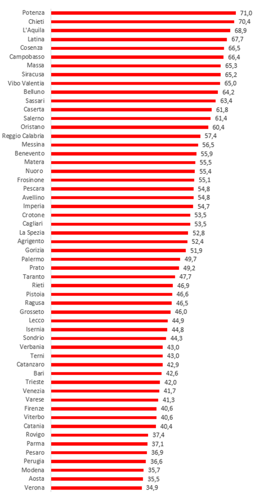 Trieste segue con una perdita del 42%, classificandosi al 43° posto a livello nazionale. Gli altri capoluoghi friulani mostrano risultati migliori: Udine presenta una dispersione del 21,3%, mentre Pordenone si distingue con una perdita molto contenuta del 12,1%.