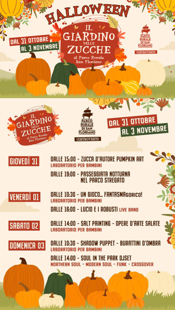 Il Giardino delle Zucche al Parco Rurale San Floriano è un’opportunità imperdibile per chi desidera vivere un Halloween diverso dal solito, all’insegna della natura e della creatività. Le attività proposte sono varie e pensate per ogni fascia d’età, garantendo momenti di divertimento e apprendimento per i più piccoli e di svago per gli adulti. Non perdete l’occasione di partecipare a questo evento unico, dove le zucche diventano protagoniste di un mondo magico e colorato.